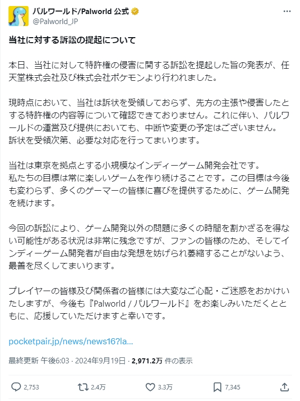 【悲報】任天堂に訴えられたパルワールドさん、お気持ち表明するも批判殺到してしまう