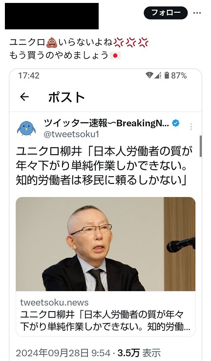 ユニクロ柳井「日本人労働者の質が年々下がり単純作業しかできない。知的労働者は移民に頼るしかない」 https://t.co/XmgjMRO1e3