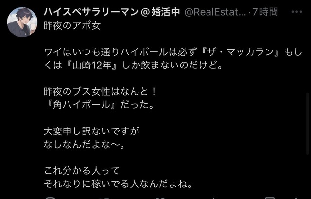 それなりに稼いでる人なんだよね。— ハイスペサラリーマン@婚活中 (@RealEstate03XX) November 2, 2024