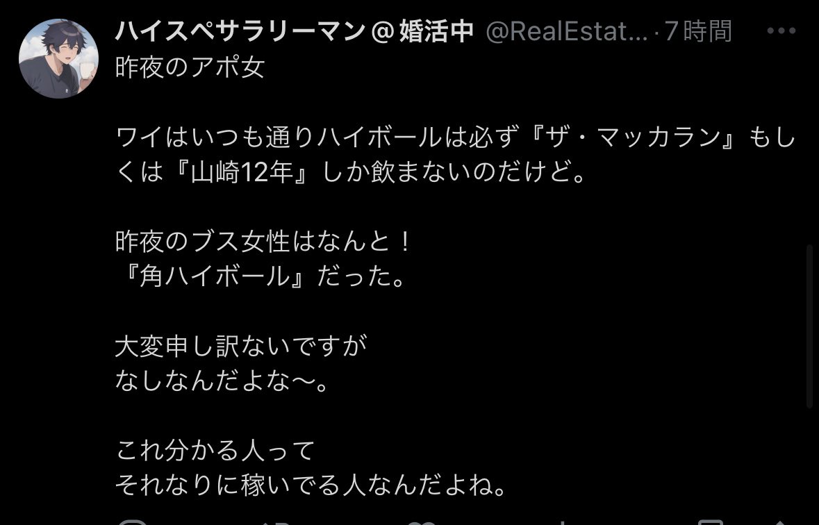 それなりに稼いでる人なんだよね。— ハイスペサラリーマン@婚活中 (@RealEstate03XX) November 2, 2024