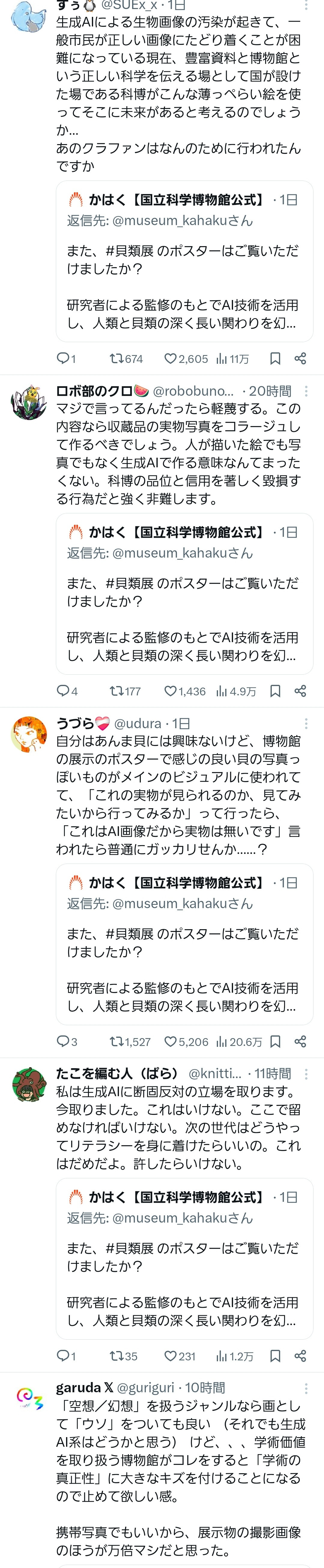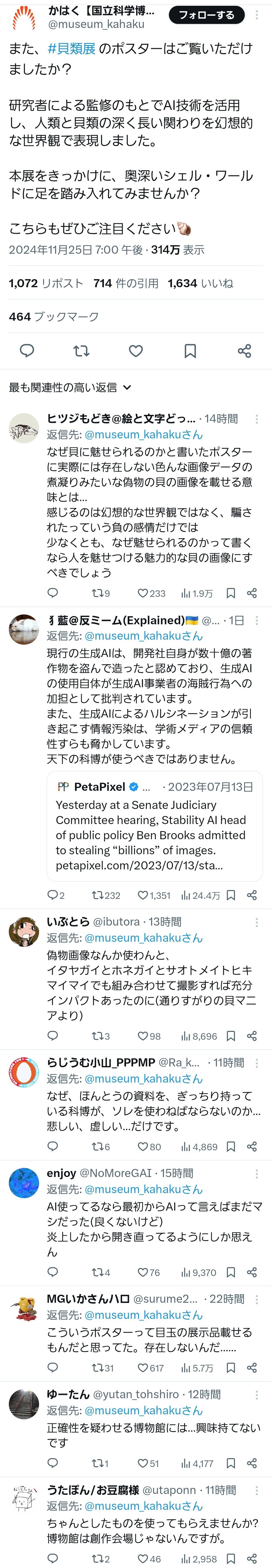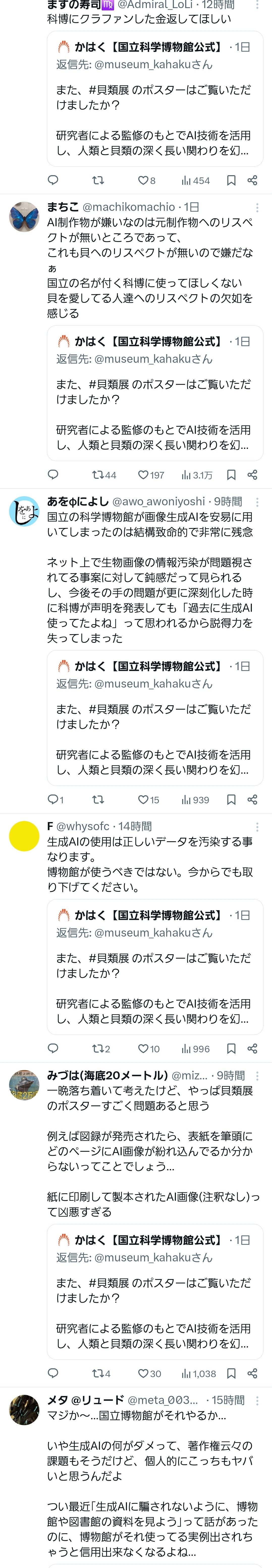 【悲報】生成AI使用を疑われた国立科学博物館、AIの使用を白状するも余計に炎上してしまう 2024年11月27日 最終更新日時 : 2024年11月27日 ココナラwordpress 広告エリア 東京都「東京は年間約1.5兆円も国に奪われあらゆる都道府県に搾取されてきたのだ」 【画像あり】17才美少女、19才の彼氏を200万円で人身売買する→・・・! 【動画】女流棋士さん「妊娠したからタイトル戦の日程ずらして?」⇒! 「スターウォーズ」2タイトルが発表!アクションRPG『Star Wars: Fate of the Old Republic』(時期未定)、レースゲーム『スター・ウォーズ ギャラクティック・レーサー』は2026年発売 【悲報】外人「ナゼ日本のロボットは剣で戦うのデスか。銃の方がツヨイヨ!」 【画像】なぁ、彼女がやべーもん置いていったんだが・・・・→! キーエンスの事が好きすぎる元キーエンスのキーエンス営業マンのキーエンストークwwwwwwwwwwww 【悲報】ブリーチ、マジでハゲの原因になることが判明・・・ 【超愕】ママカースト、地獄すぎるwwwwwww(※画像あり) 【画像】ZOZO、ロリコンステッカーを販売してしまうwwwwwwww 【悲報】生成AI使用を疑われた国立科学博物館、AIの使用を白状するも余計に炎上してしまう 1:名無し: 2024/11/27(水) 07:19:18.996 ID:EBCCuGhsC 問題のイラスト 2:名無し: 2024/11/27(水) 07:19:39.473 ID:EBCCuGhsC 問い詰められて白状した結果 16:名無し: 2024/11/27(水) 07:23:33.383 ID:UB6JwYbmS AIで存在しない生物の画像が生成されて検索汚染の問題が起きてるのにポスターにAI作るのは批判されるわなそれくらいイラストレーター雇えよ 続きを読む 続きを見る(外部サイト) 広告エリア 東京都「東京は年間約1.5兆円も国に奪われあらゆる都道府県に搾取されてきたのだ」 【画像あり】17才美少女、19才の彼氏を200万円で人身売買する→・・・! 【動画】女流棋士さん「妊娠したからタイトル戦の日程ずらして?」⇒! 「スターウォーズ」2タイトルが発表!アクションRPG『Star Wars: Fate of the Old Republic』(時期未定)、レースゲーム『スター・ウォーズ ギャラクティック・レーサー』は2026年発売 【悲報】外人「ナゼ日本のロボットは剣で戦うのデスか。銃の方がツヨイヨ!」 【画像】なぁ、彼女がやべーもん置いていったんだが・・・・→! キーエンスの事が好きすぎる元キーエンスのキーエンス営業マンのキーエンストークwwwwwwwwwwww 【悲報】ブリーチ、マジでハゲの原因になることが判明・・・ 関連記事 関連記事はありません。