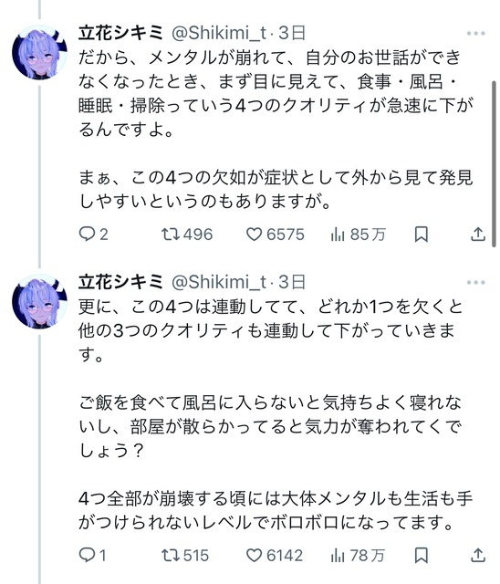 X「『食事』『風呂』『睡眠』『掃除』が出来てないとメンタル病みます。その理由は…」←20万いいね