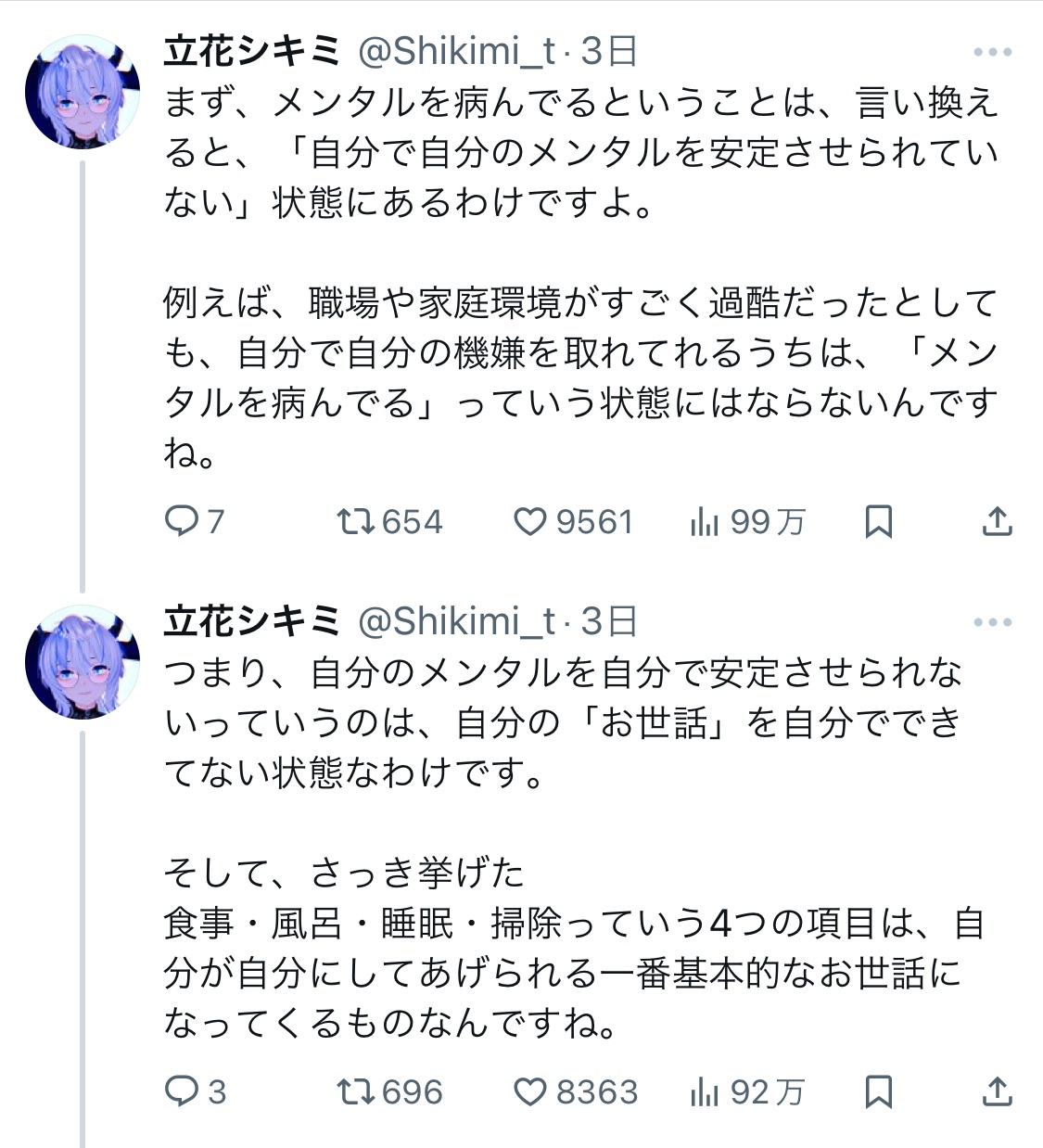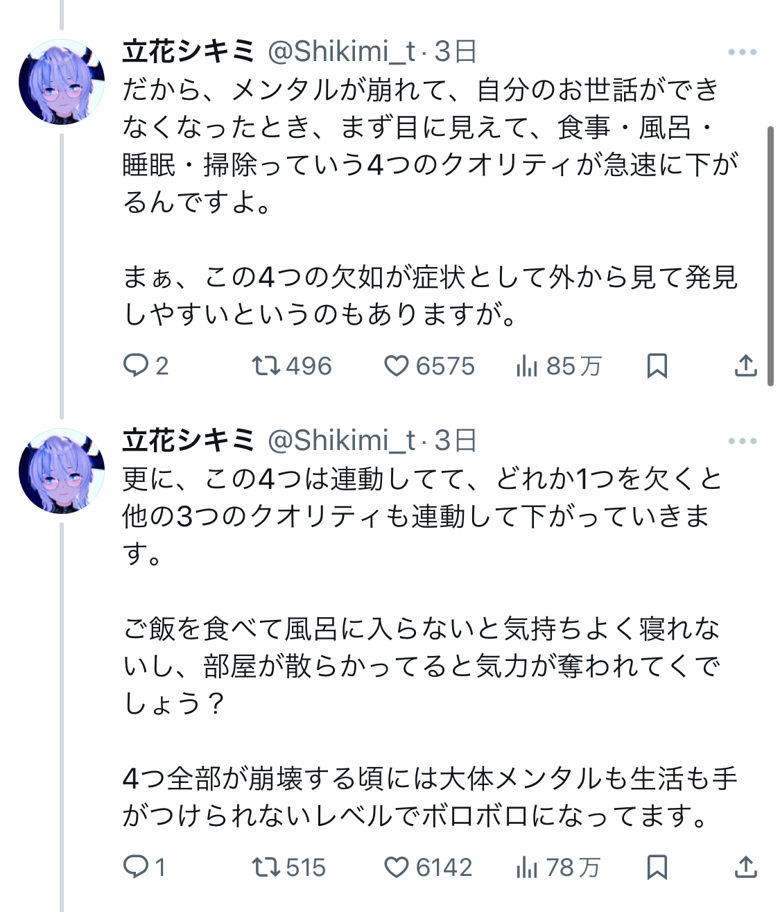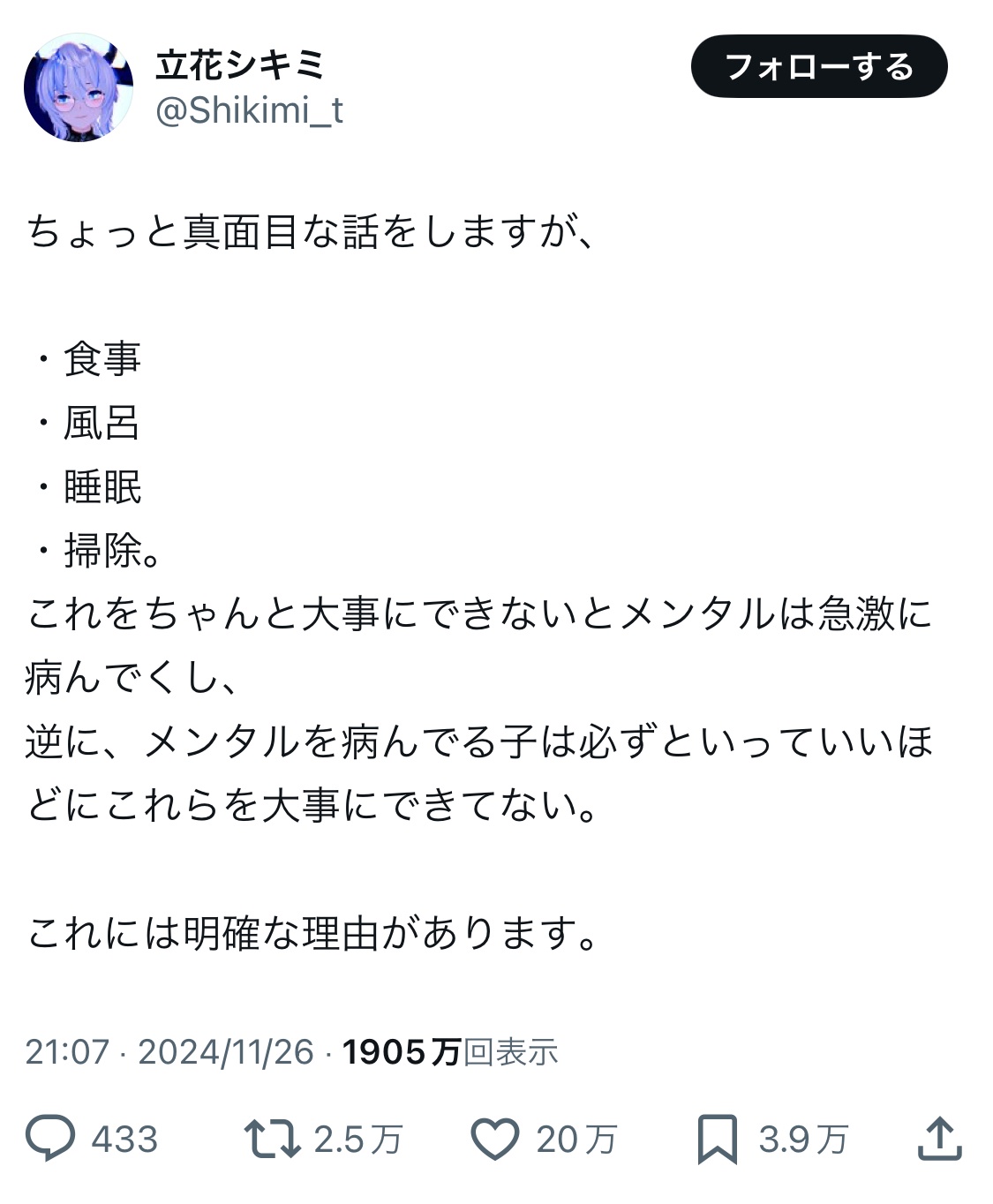 X「『食事』『風呂』『睡眠』『掃除』が出来てないとメンタル病みます。その理由は…」←20万いいね