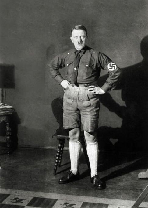 キリリと引き締まった顔つきで、ファッションモデルのようにポーズを決めている総統閣下。しかしその下半身に目を向けると、ボーイスカウトのような短パンと白い長靴下が目にとまります。
