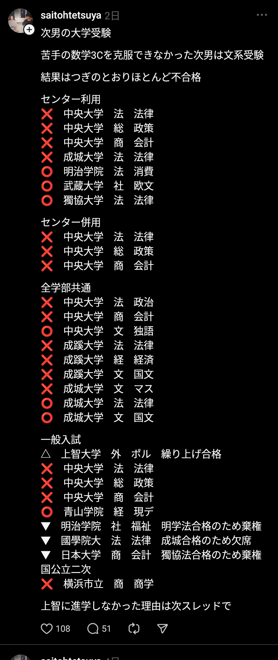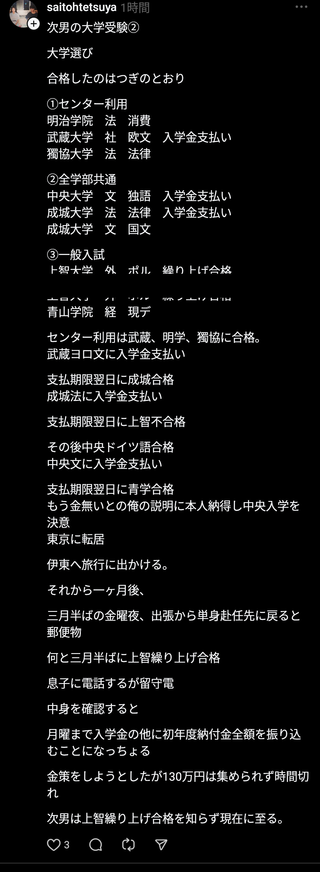 当の息子本人は上智合格を知らないらしい