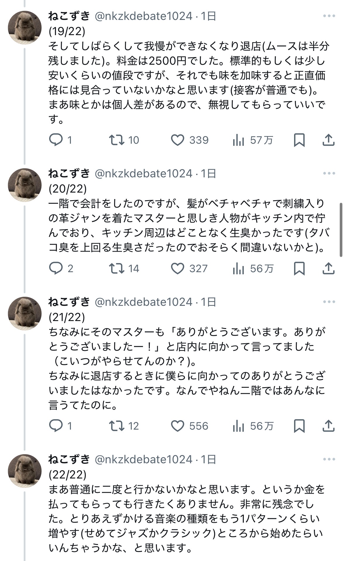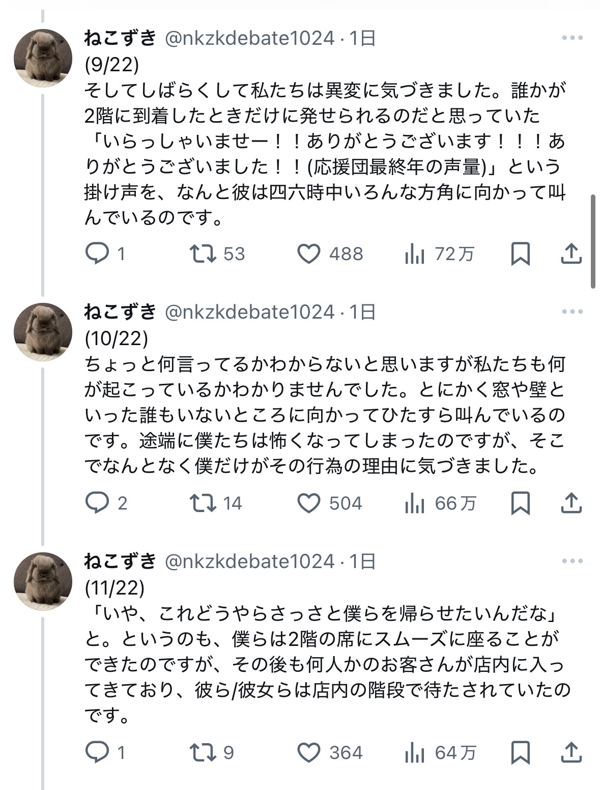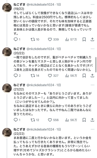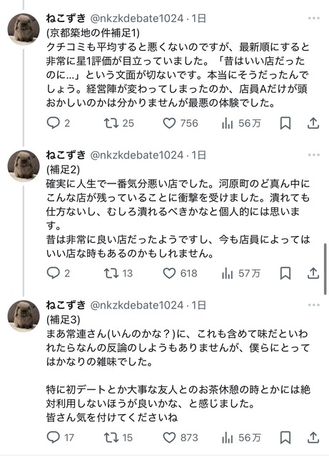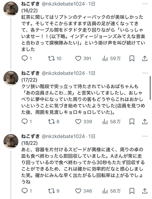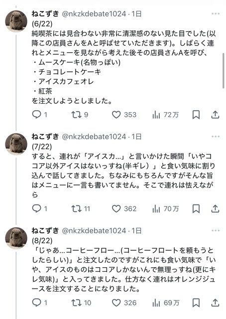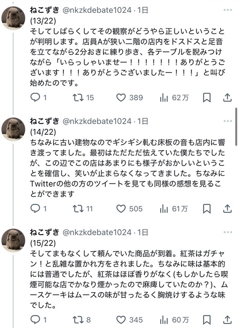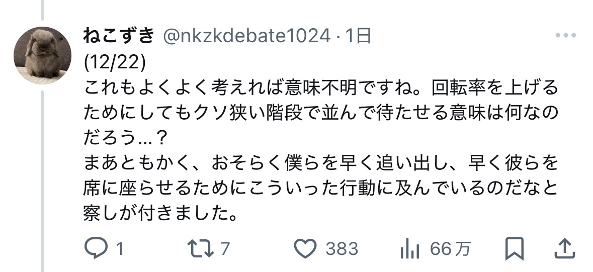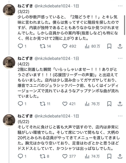 私と連れの二人で入店したのですが、まず20代前後の店員に「何名ですか?」と聞かれました。そこで連れが「2名です」と答え、その後店員が早口かつ小声で「ニカイドウゾ」と言った(ぽい)のですが、連れも私も聞き取ることができませんでした。— ねこずき (@nkzkdebate1024) January 12, 2025
