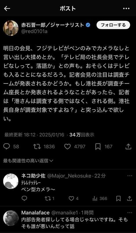【悲報】フジテレビ「社長が臨時会見するけど、会場が狭いから中継できません><」
