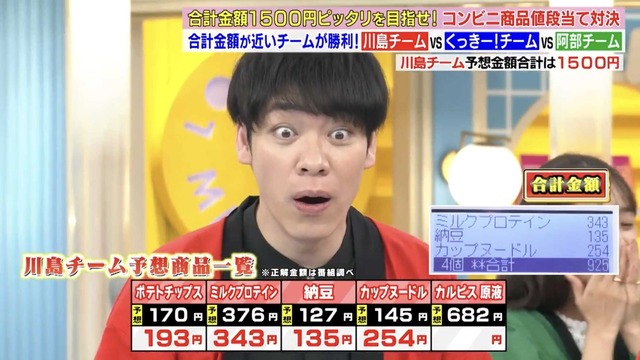 TBSの朝の生番組「ラヴィット!」(月~金曜午前8時)が1月17日に放送され、合計金額1500円ピッタリを目指す「コンビニ商品値段当て対決」が行われた。