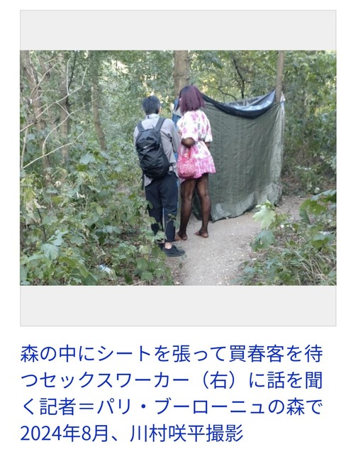 2024年夏、オリンピックとパラリンピックが開かれたパリ市の西の外れにある森林公園「ブーローニュの森」。女性たちは森の中に張ったテントなどで性的なサービスをするために客を待っていた。森を訪れた記者に女性たちは「30ユーロ」と判で押したように料金を口にする。