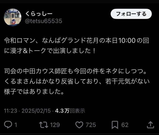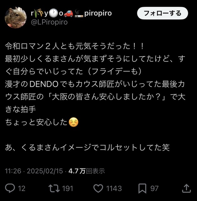 昨日令和ロマンがオンラインカジノで事情聴取されて、今日にNGKに出演して自らイジって、その後に中田カウスが出てきて「みなさん、安心してください」と笑顔で言った!っていうの、落語みたいなキレイなオチだな(╹▿╹๑)