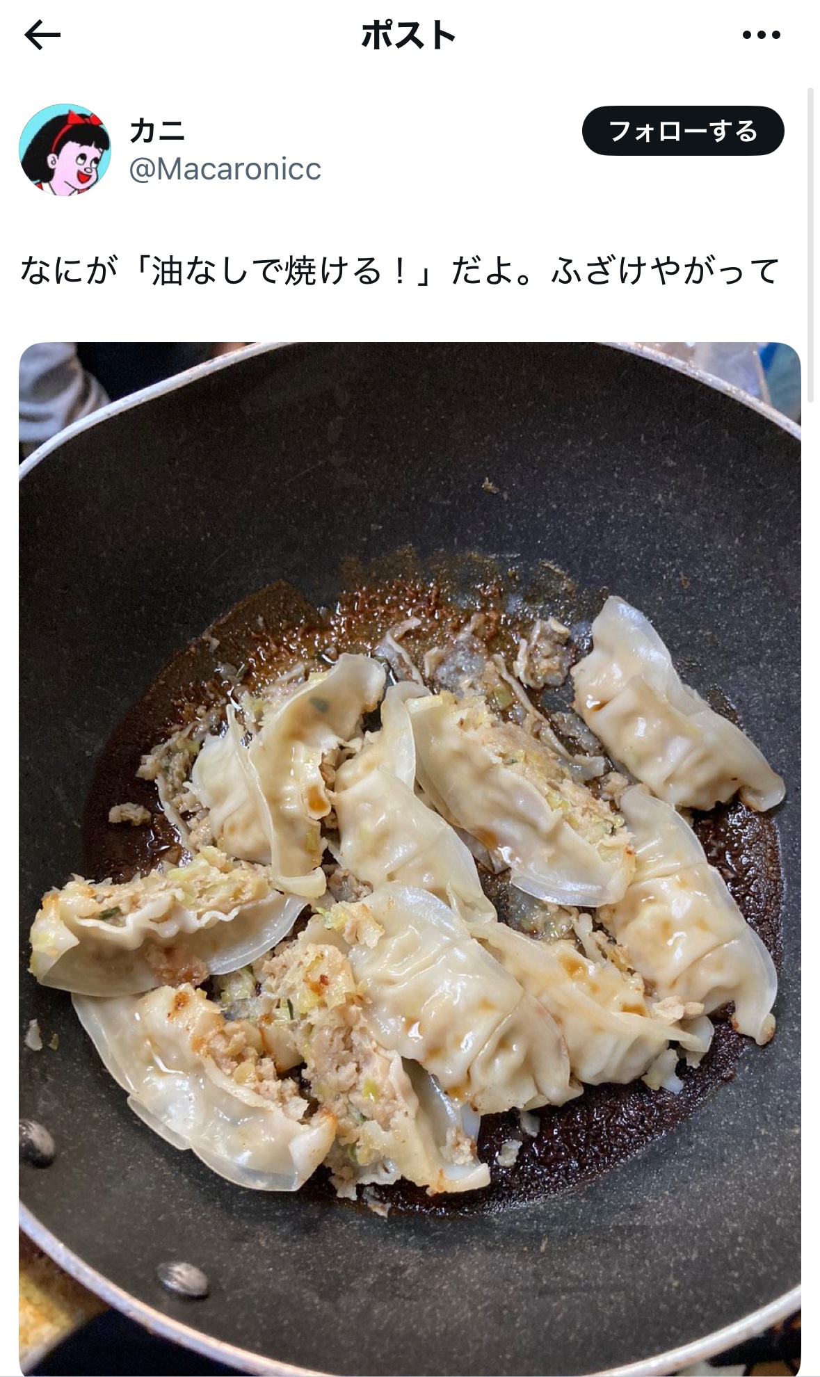 【画像】『油なし』で焼ける冷凍餃子上手く焼けない民、続出してしまうwwwwww