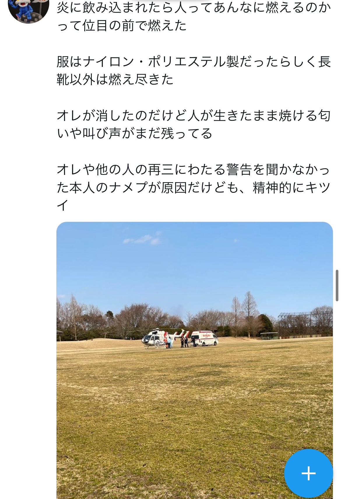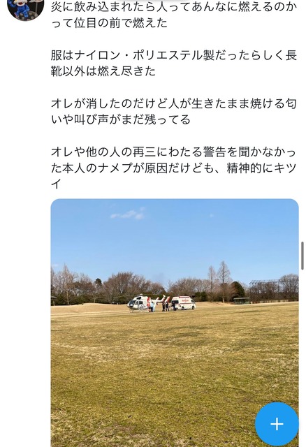 Xユーザーの炎を見守る少女(バイク垢)さん: 「これ何事かと思ったら野焼きに化繊の服で来た大馬鹿者が燃えたらしい… 綿以外は燃えやすいというのは昔からの常識なのに…」 / X