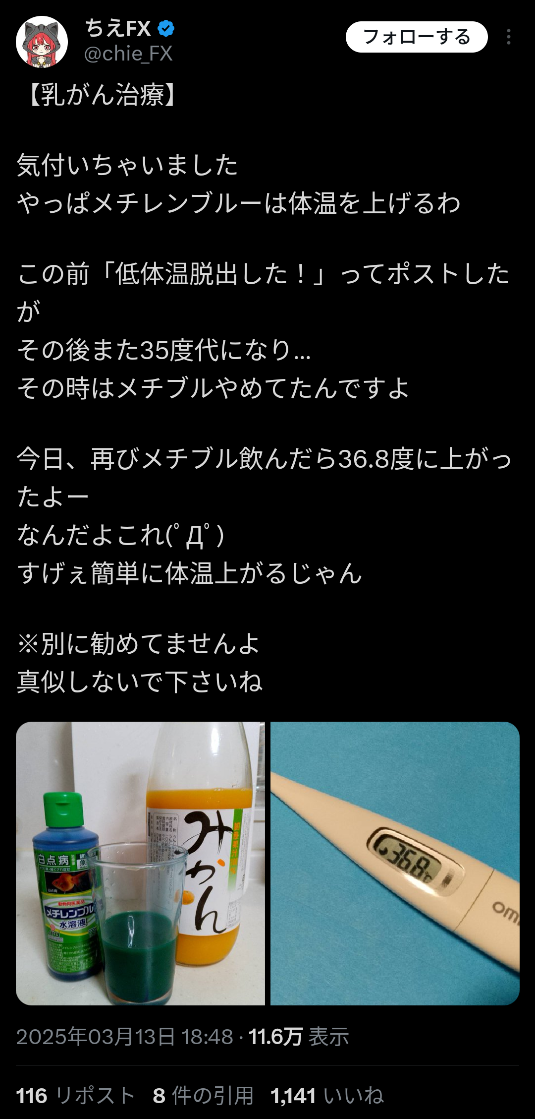 【画像】X民「低体温症だったけど魚用メチレンブルー飲んだら治るわ!」