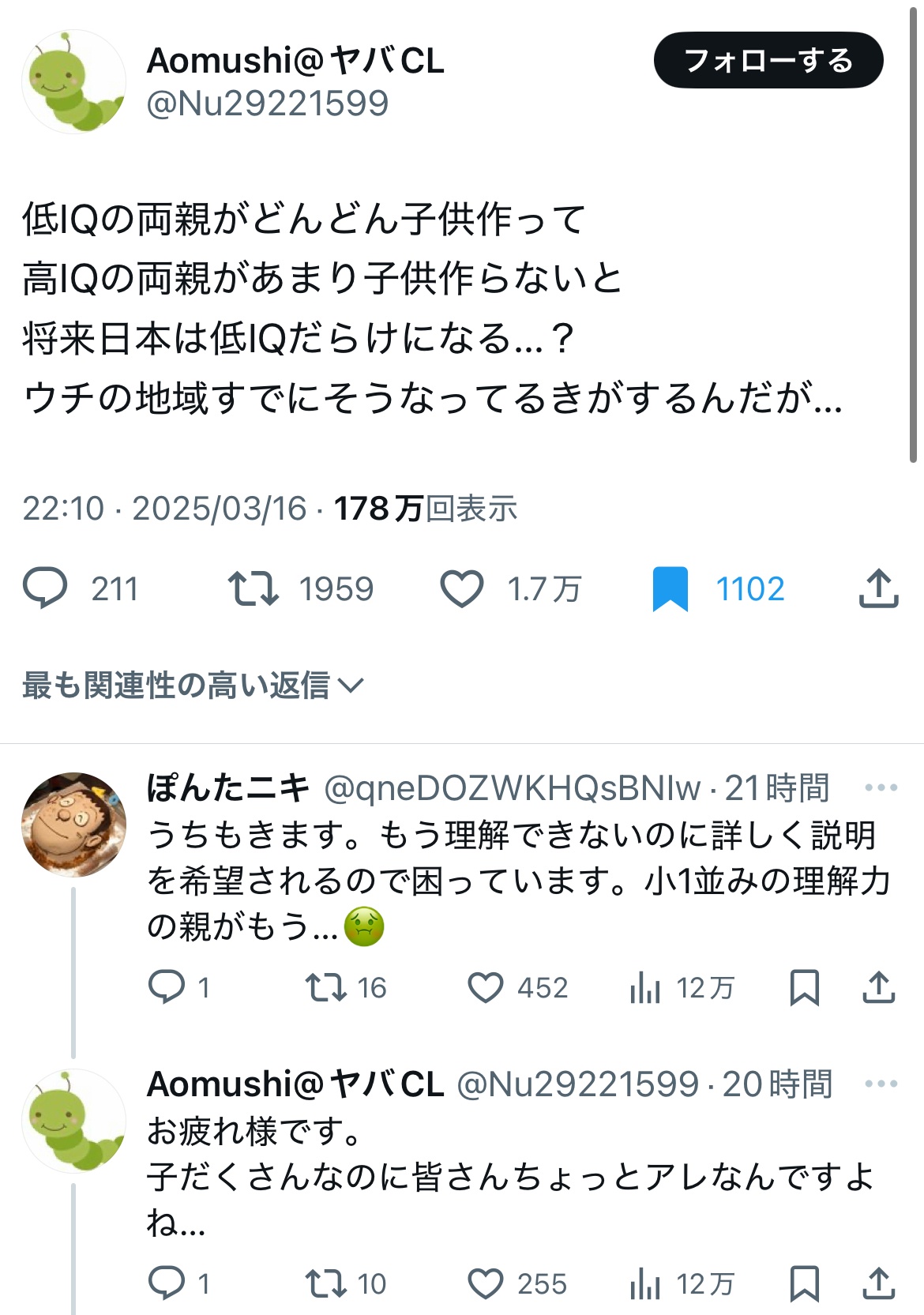 日本人、ようやく気づく「高IQの人が子供作らず低IQの人が子供作ってる。日本は低IQだらけになってる」